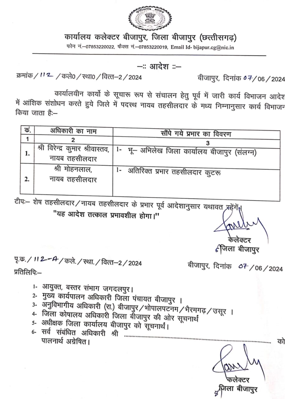 जिले के कलेक्टर अनुराग पाण्डेय ने प्रशासनिक व्यवस्था के तहत कुटरू तहसीदार वीरेंद्र श्रीवास्तव को हटा कर उनके स्थान पर मोहन लाल नायब तहसीलदार को प्रभार दिया है। जारी आदेश में कहा है कि कार्यालयीन कार्यो के सूचारू रूप से संचालन हेतु पूर्व में जारी कार्य विभाजन आदेश में आंशिक संशोधन करते हुये जिले में पदस्थ नायब तहसीलदार में कार्य विभाजन किया जाता है।