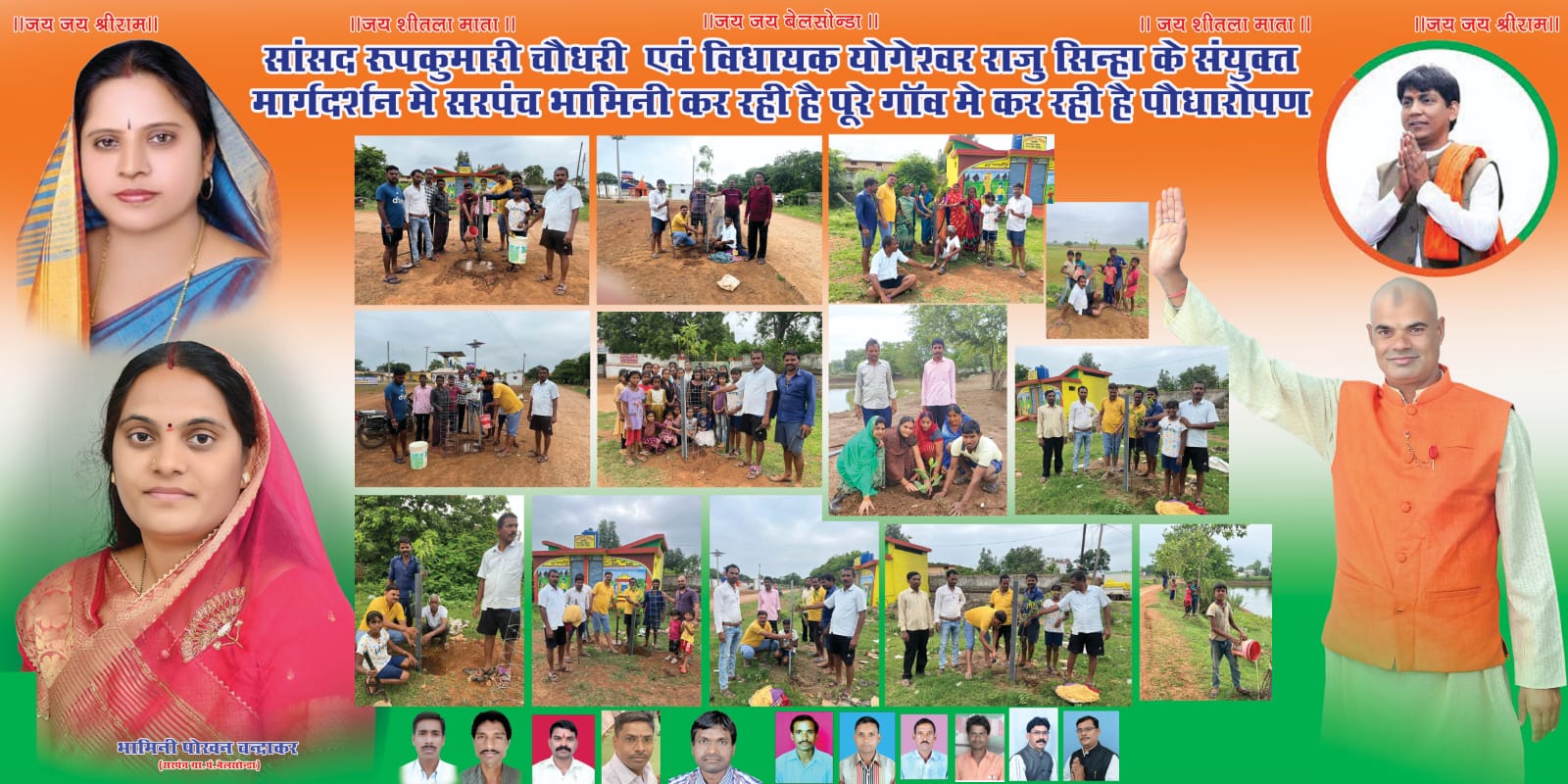 बेलसोंडा / महासमुंद – भाजपा की जिला कार्यकारिणी की सदस्य एवं ग्राम पंचायत बेलसोंडा की सरपंच श्रीमती भामिनी पोखन चन्द्राकर सांसद श्रीमती रूपकुमारी चौधरी एवं विधायक योगेश्वर राजू सिन्हा के संयुक्त मार्गदर्शन मे श्रद्धेय श्री विवेकानंद सेवा संस्थान के युवाओं को लेकर पूरे पखवाड़ा भर पौधारोपण कर रही है इसी कड़ी मे रविवार दिनांक 14 जुलाई को सुबह गांव के स्वागत द्वार से लेकर नंदी भगवान तक सड़क के दोनों तरफ पौधारोपड़ किया गया जिसमें मुख्य रूप से सरपंच भामिनी के साथ सरपंच प्रतिनिधि एवं जनसेवक पोखन लाल चन्द्राकर, विवेकानंद सेवा संस्थान के अध्यक्ष शत्रुघ्न साहू, कोषाध्यक्ष उदेराम साहू, उपाध्यक्ष तेजराम धीवर, संरक्षक यज्ञ देवांगन एवम गिरधारी धीवर, नन्ही परी कु. आहुति देवांगन के साथ गांव के सम्मानीय महेश चन्द्राकर, गजाधर चन्द्राकर, माखन चन्द्राकर, नेहरू चन्द्राकर, राजेन्द्र साहू, सुखराम यादव, गुरुजी संतोष चन्द्राकर, जीतलाल धीवरधरम कोसले, मुन्ना चन्द्राकर, राजू चन्द्राकर, बलराम चन्द्राकर, चुन्नी लाल चन्द्राकर एवं गांव की महिलाओं तथा कस्तूरबा ट्रस्ट के बच्चों ने पूरी तन्मयता के साथ सहयोग किया। सरपंच भामिनी ने बताया कि प्रधानमंत्री श्री नरेन्द्र मोदी जी के आह्वान एवं हमारी सांसद रूपकुमारी चौधरी तथा विधायक योगेश्वर सिन्हा के संयुक्त मार्गदर्शन मे गांव के युवाओं को साथ लेकर पौधरोपड़ कर रही है तथा वास्तव मे मां के नाम एक पेड़ लगाने से मन को आत्मिक शांति तथा आनंद की अनुभूति प्राप्त होती है, इस पुण्य कार्य को करने मे युवाओं का मनोबल बढ़ रहा है।