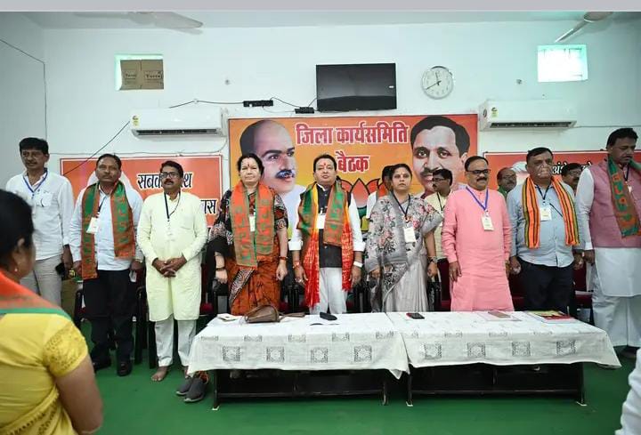 जिला कार्यसमिति की बैठक के मुख्यवक्ता जिला संगठन प्रभारी जगन्नाथ पाणिग्रही ने देश प्रदेश में भाजपा की सरकार बनाने में अहम योगदान देने वाले कार्यकर्ताओ के अथक परिश्रम ऊर्जा और उत्साह की सराहना करते हुए कहा कि भाजपा के शीर्ष, नेतृत्व ने इस बार मण्डल एवं बूथ स्तर तक के कार्यकर्ताओ के योगदान को सम्मान देते हुए प्रदेश एवं जिला संगठन की बैठक में आमंत्रित कर नई पहल शुरू किया है। सांसद चौधरी ने कहा कि विश्व की सबसे बड़ी राजनैतिक पार्टी के हम सदस्य है ये हम सभी के लिए गर्व और सम्मान की बात है। भाजपा के कार्यकर्ताओ सहित मतदाताओं का सम्मान करके हमने उनके दिए गए योगदान को अमूल्य धरोहर की तरह सँजो कर रखा है। कार्यकर्ताओ ने दिनरात परिश्रम कर प्रधानमंत्री मोदी जी की योजनाओं को जनजन तंक पहुंचाया है। महिलाओं के सम्मान के साथ सर्ववर्ग के विकास के लिए समर्पित भाजपा की सरकार अपने इस कार्यकाल में आपकी उम्मीदो पर खरा उतरेगी। बैठक को अन्य अतिथियों ने भी संबोधित किया। बैठक का समापन राष्ट्रगान के साथ किया गया। बैठक का संचालन जिला महामंत्री प्रदीप चंद्राकर एवं आभार जिलामंत्री निरंजना शर्मा ने किया। बैठक में प्रमुख रूप से पूर्व विधायक प्रीतम दीवान, रामलाल चौहान, परेश बागबाहरा जिला पंचायत अध्यक्ष उषा पटेल, वरिष्ठ भाजपा नेता छतरसिंह नायक, मोती साहू, ललिता अग्रवाल सहित भाजपा प्रदेश, जिला पदाधिकारी, कार्यसमिति सदस्य, सभी मण्डल अध्यक्ष महामंत्री, मोर्चा प्रकोष्ठ के पदाधिकारी, जिला, जनपद, नगर पंचायत के अध्यक्ष, उपाध्यक्ष, सदस्य, पार्षदगण सहित सभी अपेक्षित कार्यकर्ता उपस्थित थे।
