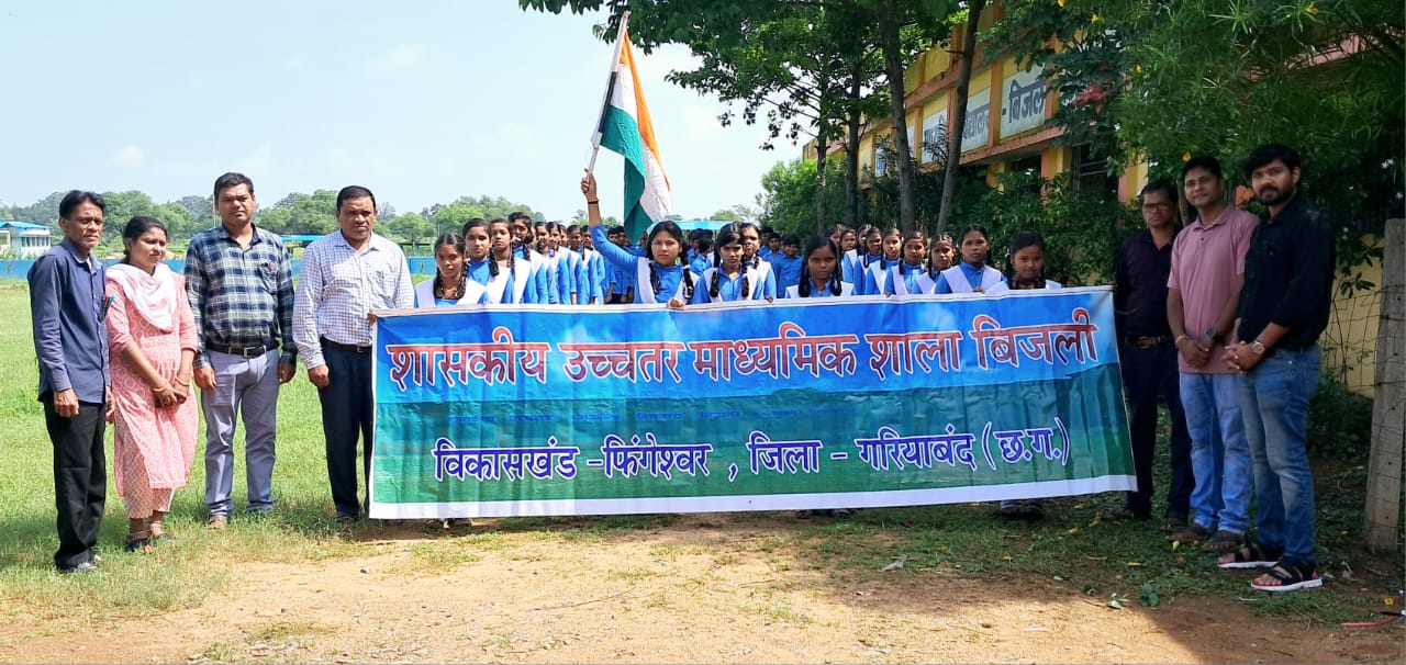 फिंगेश्वर:–हर घर तिरंगा अभियान 15 अगस्त 2024 को 77 वीं स्वतंत्रता दिवस के अवसर पर 9 से 15 अगस्त 2024 तक चलाया जा रहा है.हर घर तिरंगा अभियान के प्रति लोगों में जागरूकता लाने हेतु शासकीय उच्चतर माध्यमिक विद्यालय बिजली के प्राचार्य पूरन लाल साहू के नेतृत्व में विद्यालय के छात्र-छात्राओं द्वारा हर घर तिरंगा, घर-घर तिरंगा के नारों के साथ रैली निकालकर ग्राम वासियों तिरंगा झंडा लगाने हेतु प्रेरित किया गया। इस अवसर पर संस्था के प्राचार्य पूरन लाल साहू ने कहा कि इस अभियान का मकसद लोगों को अपने घरों में तिरंगा फहराने के लिए प्रेरित करना है इससे लोगों में देशभक्ति की भावना जागृत होगी। प्रत्येक व्यक्ति के मन में राष्ट्रभक्ति सेवा, प्रेम, उत्साह, त्याग और बलिदान की भावना को जगाते हुए राष्ट्रीय ध्वज के प्रति सम्मान में भी वृद्धि हो.उन्होंने आगे कहा कि हर घर तिरंगा एक ऐसा अभियान है जो आजादी का अमृत महोत्सव के तत्वाधान में लोगों को तिरंगा घर लाने और भारत की आजादी को चिन्हित करने के लिए इसे फहराने व प्रोत्साहित करने के लिए शुरू किया गया है.हम सभी को अपने राष्ट्र के प्रति समर्पित भाव से अपने घरों पर हमारी एकता व अखंडता का प्रतीक राष्ट्रीय ध्वज फ़हराना है। इस अवसर पर संस्था के प्राचार्य पूरन लाल साहू, व्याख्याता दिनेश कुमार साहू, विनय कुमार साहू,, नरेन्द्र कुमार वर्मा, गीतांजलि नेताम,व्यायाम शिक्षक नकुल राम साहू, रुद्रप्रताप साहू भृत्य आकाश सूर्यवंशी, सफाई कर्मचारी यशवंत साहू व छात्र छात्राएं उपस्थित थे।