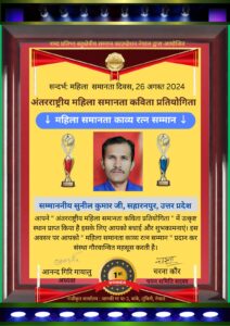 नेपाल/लुंबिनी :- जिले के प्रसिद्ध कवि तथा लेखक का नेपाल में सम्मान किया गया है। नेपाल के लुंबिनी में आयोजित किए गए एक अंतर राष्ट्रिय स्तर के कार्यक्रम में उत्तर प्रदेश के सहारनपुर जिले की शान सुनील कुमार को सम्मानित किया गया है। नेपाल की प्रसिद्ध संस्था शब्द प्रतिभा बहुक्षेत्रीय सम्मान फाउन्डेशन नेपाल द्वारा भाषा तथा साहित्य के क्षेत्र में उल्लेखनीय योगदान देने वाले रचनाकारों को एक ऑनलाइन प्रतियोगिता के माध्यम से आज सम्मानित किया गया है। महिला समानता दिवस के मौके पर शब्द प्रतिभा बहुक्षेत्रीय सम्मान फाउन्डेशन नेपाल द्वारा आयोजित किए गए हिंदी दिवस अंतरराष्ट्रीय कविता प्रतियोगिता में सुनील कुमार को ” महिला समानता काव्य रत्न सम्मान से सम्मानित किया गया है।