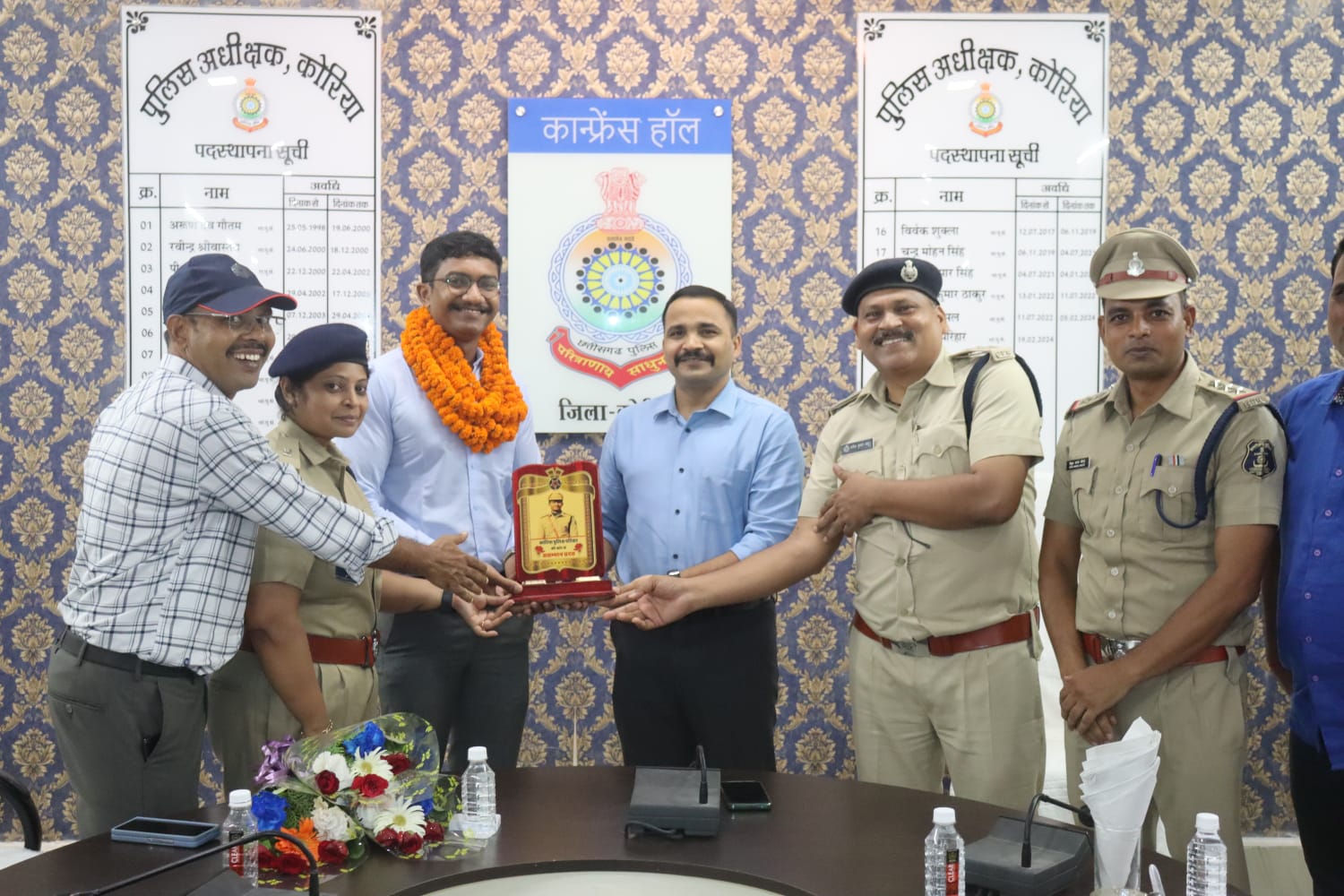 बैकुंठपुर/कोरिया – रक्षित केंद्र बैकुंठपुर के कॉन्फ्रेंस हॉल में एक विदाई समारोह का आयोजन किया गया, जिसमें जिला कोरिया के पुलिस अधीक्षक सूरज सिंह परिहार के निर्देशन में प्रशिक्षु उप पुलिस अधीक्षक रविकांत सहारे को सम्मानित किया गया।श्री सहारे का स्थानांतरण जिला कोरिया से विशेष आसूचना शाखा, जिला सुकमा में उप पुलिस अधीक्षक के रूप में हुआ है। रविकांत सहारे ने 01 मई 2023 को जिला कोरिया में प्रशिक्षु उप पुलिस अधीक्षक के रूप में अपना कार्यभार संभाला था। इस अवधि में, उन्होंने पुलिस अधीक्षक कार्यालय की विभिन्न शाखाओं, रक्षित केंद्र बैकुंठपुर, एवं जिले के विभिन्न थानों में महत्वपूर्ण प्रशिक्षण प्राप्त किया। उनके प्रशिक्षण के दौरान, उन्होंने थाना प्रभारी के रूप में चरचा और बैकुंठपुर थानों में भी अपनी सेवाएं दीं। इस अवधि में, श्री सहारे ने अनेक महत्वपूर्ण मामलों जैसे चोरी के अपराधों और अन्य शिकायतों का सफलतापूर्वक निपटारा किया। इसके अलावा, उन्होंने पुलिस अधीक्षक कोरिया और वरिष्ठ अधिकारियों द्वारा सौंपे गए विभिन्न कार्यों को भी सुचारु रूप से संचालित किया।