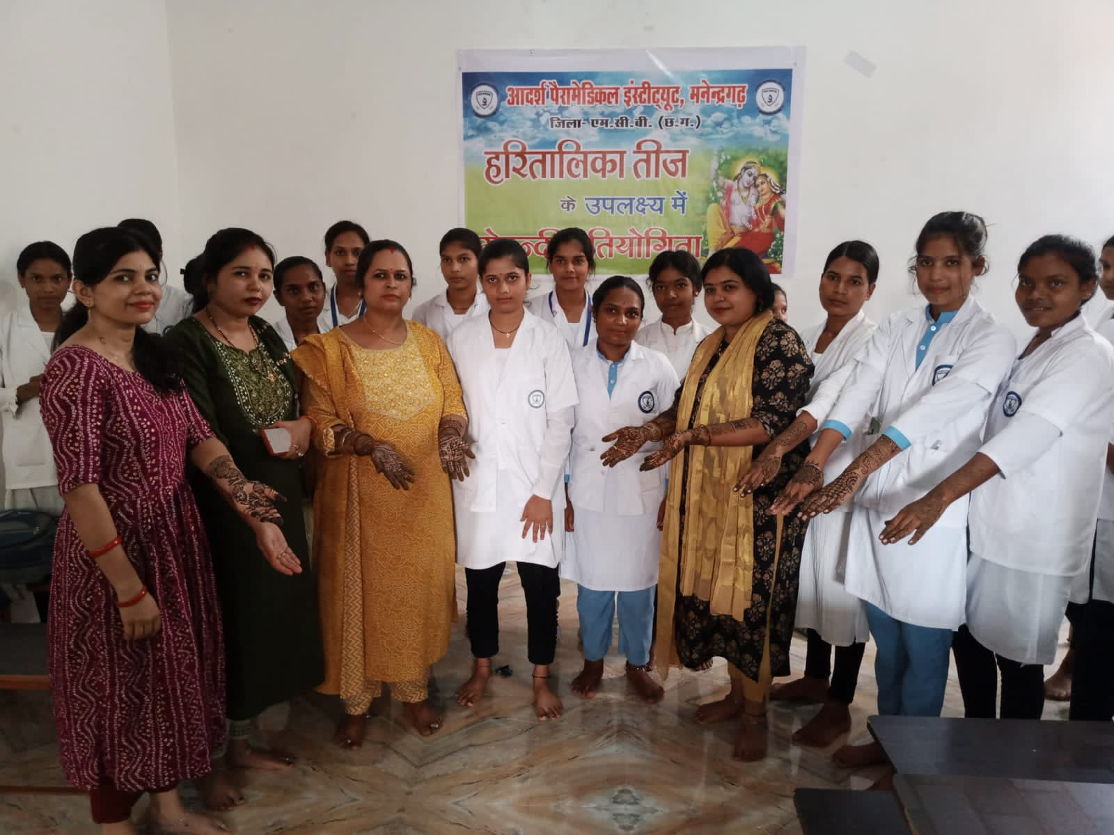 मनेंद्रगढ़/एमसीबी। छत्तीसगढ़ में महिलाओं के सबसे बड़े त्यौहार हरितालिका तीज के पूर्व जिले के मुख्यालय मनेन्द्रगढ़ में आदर्श पैरामेडिकल इंस्टीट्यूट के छात्र छात्राओं के लिये मेहंदी प्रतियोगिता का आयोजन किया गया, जिसमें सभी बच्चों ने बढ़चढ़ कर हिस्सा लिया। आदर्श पैरामेडिकल इंस्टीट्यूट के आमाखेरवा रोड स्थित परिसर मे आयोजित इस मेहंदी प्रतियोगिता मे संस्था की सभी छात्राओं ने उत्साहपूर्वक प्रतिभाग किया। सभी छात्राओं ने अपने और आये निर्णायकों के हाथो पर अलग अलग सुन्दर मेहंदी रचा कर प्रतियोगिता जीतने के लिये अपनी पुरजोर दावेदारी प्रस्तुत की।