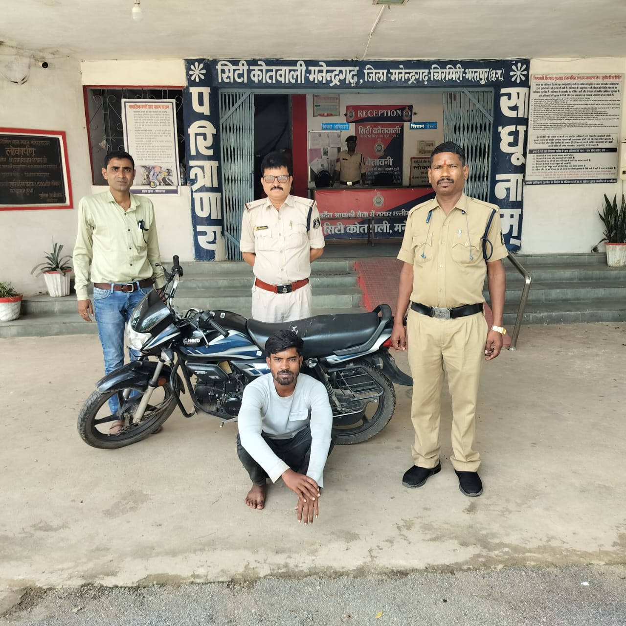 मनेंद्रगढ़/एमसीबी – घर के बाहर खड़ी मोटरसाइकिल को चोरी करने वाले आरोपी को सिटी कोतवाली पुलिस ने गिरफ्तार कर उसके पास से चोरी की गई मोटरसाइकिल को भी बरामद कर लिया है। उपरोक्त संबंध में प्राप्त जानकारी के अनुसार 11.09.2024 को प्रार्थी रोहित कुमार अग्रवाल थाना में उपस्थित होकर लिखित रिपोर्ट दर्ज कराया कि 10.09.2024 के 08.00 बजे रात वह अपनी मोटर सायकल हीरो एच.एफ. डिलक्स क्रमांक सी. जी. 16 सी.क्यू. 4729 काला नीला रंग को घर के बाहर रखा था, जिसे कोई अज्ञात व्यक्ति चोरी कर ले गया है। प्रार्थी की रिपोर्ट पर अपराध पंजीबद्ध कर विवेचना में लिया गया। मनेन्द्रगढ़ क्षेत्र में मोटर सायकल चोरी की घटना मे वृद्धि होने पर अज्ञात चोरो के विरूद्ध सख्त कार्यवाही हेतु पुलिस महानिरीक्षक सरगुजा रेंज सरगुजा एवं पुलिस अधीक्षक चन्द्रमोहन सिंह जिला एम. सी. बी के निर्देशन एवं अतिरिक्त पुलिस अधीक्षक अशोक वाडेगांवकर जिला एम. सी. बी, के मार्गदर्शन तथा एसडीओपी अलेक्सियुस टोप्पो मनेन्द्रगढ़ के नेतृत्व में विशेष टीम का गठन कर मोटर सायकल चोरी के अज्ञात आरोपी की पतासाजी की जा रही थी,इस दौरान घटना स्थल के आसपास के सी.सी.टी.व्ही. फुटेज को खंगाला गया, जिसमे एक आरोपी मोटर सायकल हीरो एच.एफ. डिलक्स को लेकर जाते दिखा, जिसके संबंध में पतासाजी करने पर मुखबिर से पता चला कि वार्ड नंबर 15 पेण्ड्रा दफाई का रहने वाला आकाश मोगरे मोटर सायकल की चोरी कर बिक्री करने के लिए घूम रहा है,जिसकी सूचना पर आकाश मोगरे को मोटर सायकल के साथ पकड़ा गया। पुछताछ करने पर उसने जुर्म करना स्वीकर किया, आरोपी को गिरफ्तार कर न्यायिक रिमाण्ड पर भेजा गया है। उक्त कार्यवाही में थाना प्रभारी सनील तिवारी, सउनि मनीष तिवारी, प्रधान आरक्षक, इस्तियाक खान,पुष्कल सिन्हा, राकेश शर्मा, आरक्षक जितेन्द्र ठाकुर, राकेश तिवारी, सैनिक विनित सोनी की महत्वपूर्ण भूमिका रही।